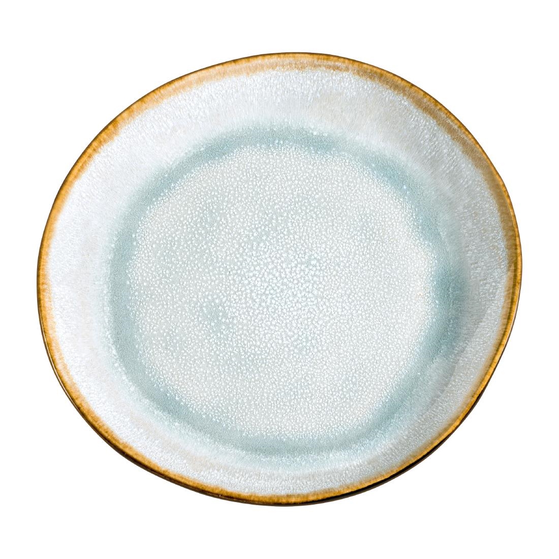 Part of the Medard De Noblat Shadow Aqua collection, these 205mm stoneware plates feature a stunning reactive glaze and an organic off-round shape that makes every piece unique. An aqua-toned interior contrasts beautifully with a textured anthracite exterior, accented by a warm golden-brown rim.