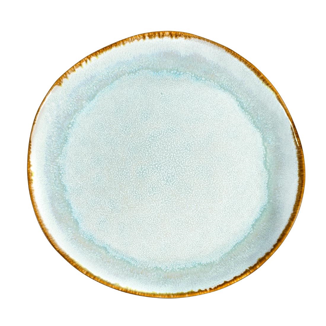 Part of the Medard De Noblat Shadow Aqua collection, these 280mm stoneware plates feature a stunning reactive glaze and an organic off-round shape that makes every piece unique. An aqua-toned interior contrasts beautifully with a textured anthracite exterior, accented by a warm golden-brown rim.