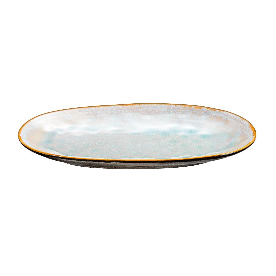 Part of the Medard De Noblat Shadow Aqua collection, these 360x220mm stoneware platters feature a stunning reactive glaze and an organic off-round shape that makes every piece unique. An aqua-toned interior contrasts beautifully with a textured anthracite exterior, accented by a warm golden-brown rim.