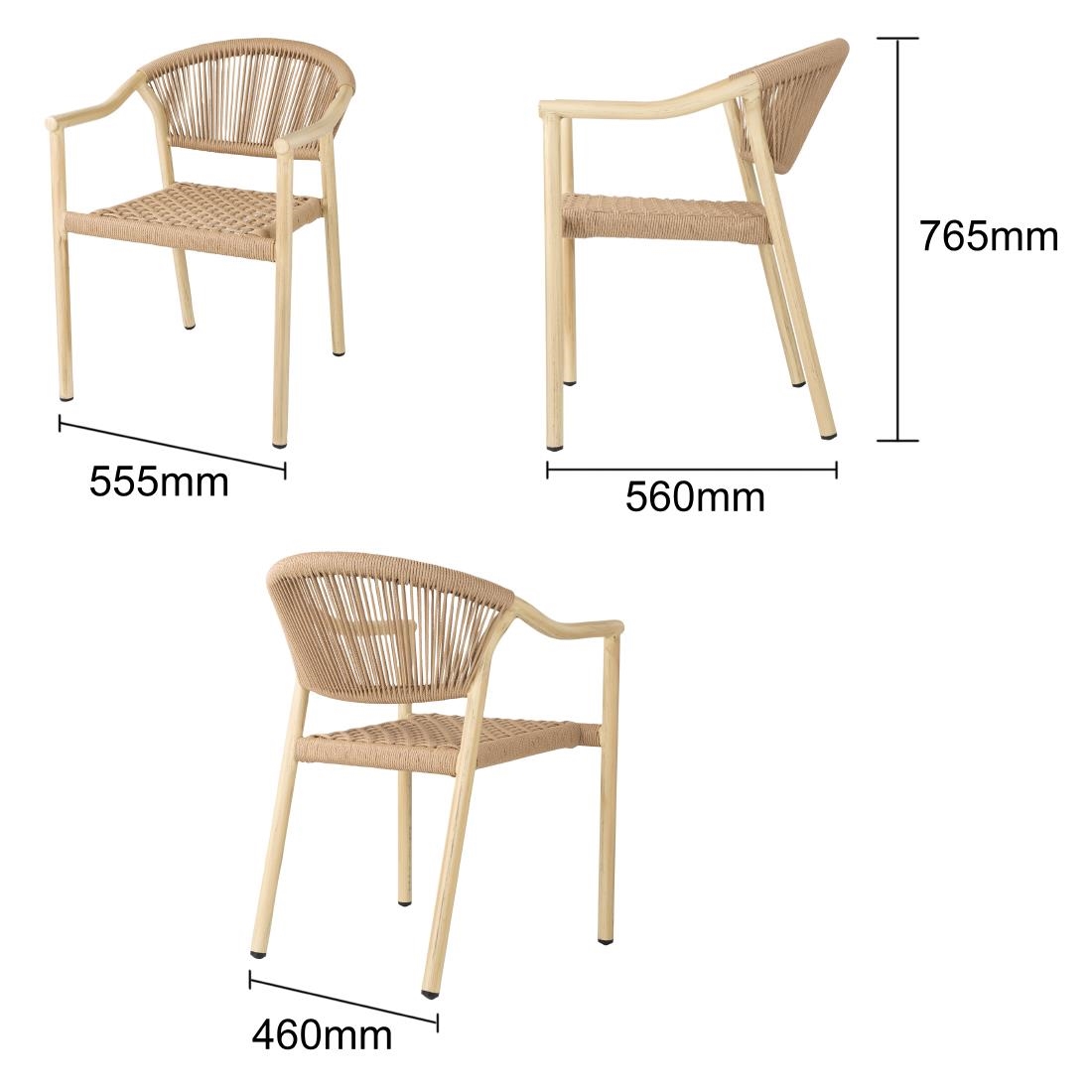 Refresh outdoor dining areas with the Bolero Dune rattan armchair in a warm honey finish. Designed for style, comfort and lasting durability, this set of four chairs is ideal for cafes, restaurants, hotels, terraces and patios.