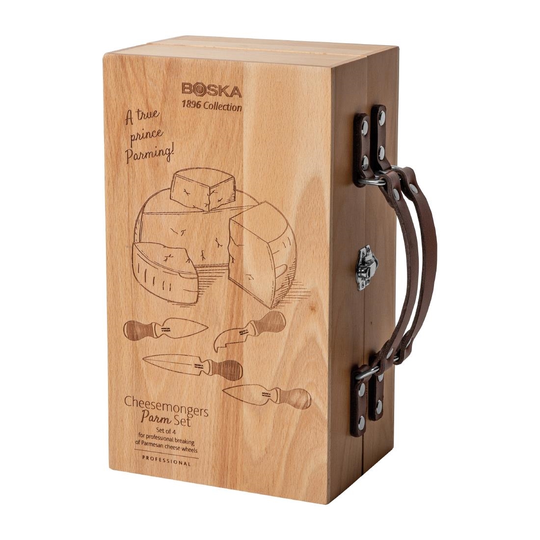 Inside the Boska Cheesemongers Parm Set Pro are four dedicated knives: a 90 mm notching knife for carefully opening Parmesan without damaging the structure, a 140 mm snap-off knife for breaking down larger pieces into neat, sale-ready portions, and two 110 mm Parmesan knives for prying off pieces and serving immediately. A stylish wooden presentation case keeps tools organised for display or transport, and also makes a standout gift for cheese enthusiasts.