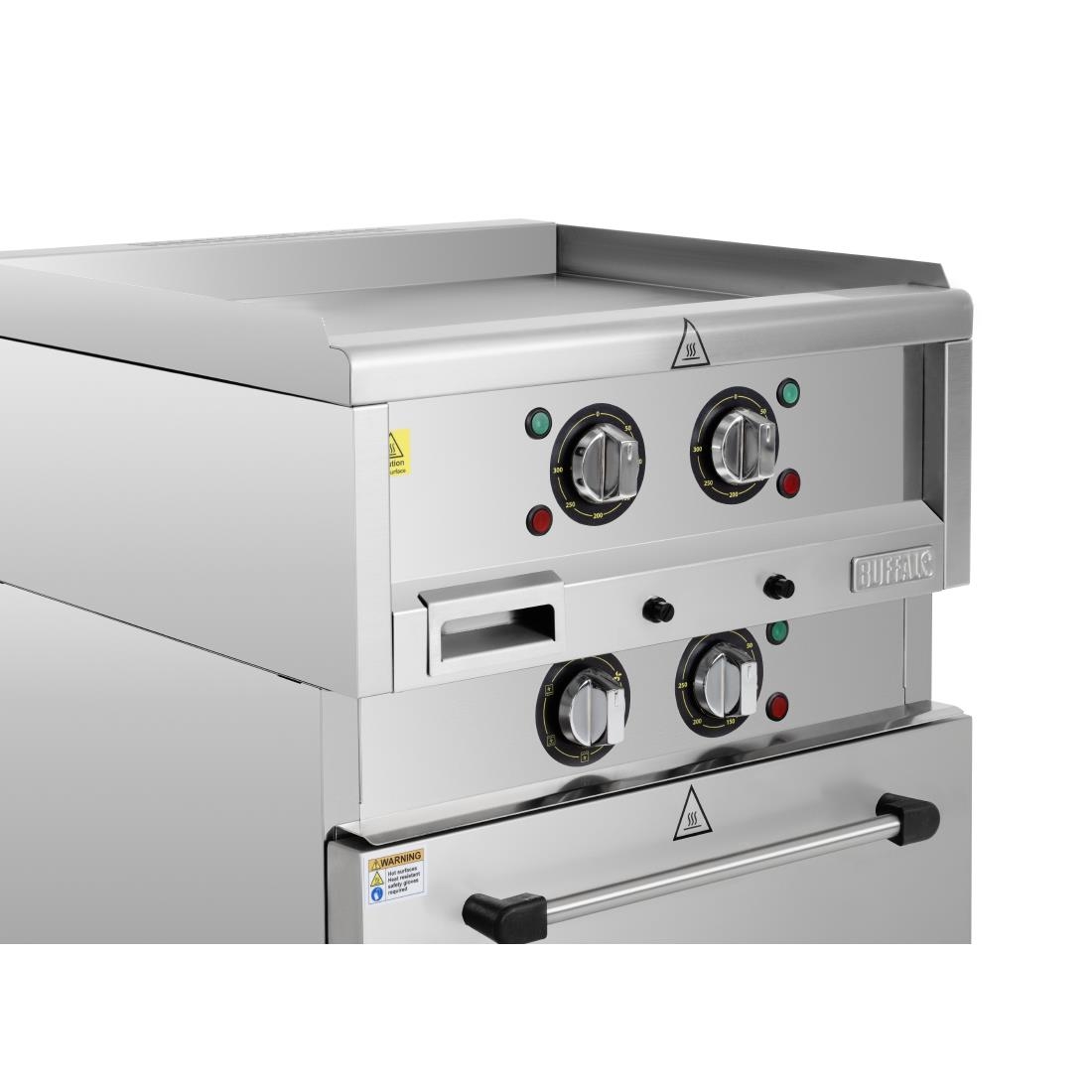 Make the most of your professional kitchen space with the Buffalo 600 Series freestanding electric griddle and convection oven combination. Two separately powered appliances, this incredibly flexible cooking station provides the versatility of a powerful Buffalo 600 Series griddle alongside the capacity and performance of the Buffalo 600 Series convection oven.