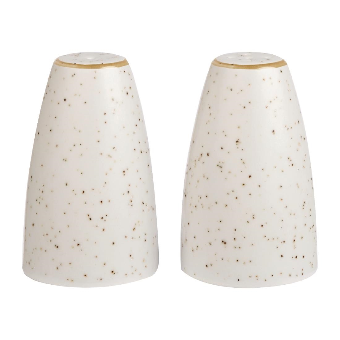 Add texture and rustic charm to any tabletop with these barley white salt shakers from Churchill’s Stonecast collection. Inspired by the changing seasons, each piece is hand-dipped in a speckled glaze and finished with a hand-applied edge band, resulting in subtle variations that make every item unique.