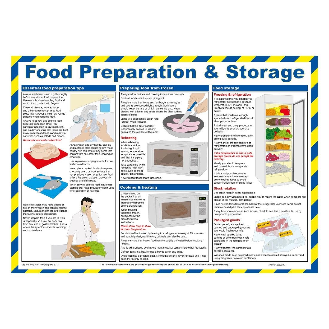 This full colour food preparation and storage poster from Mileta is designed to offer both trained and untrained staff clear vital information on food hygiene best practices. With bold, easy-to-follow graphics and simple, readable text, it’s built to stand out in a busy kitchen environment and support safe food handling.