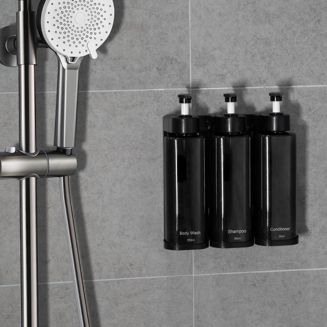 - Wall-mounted triple dispenser for body wash, shampoo and conditioner