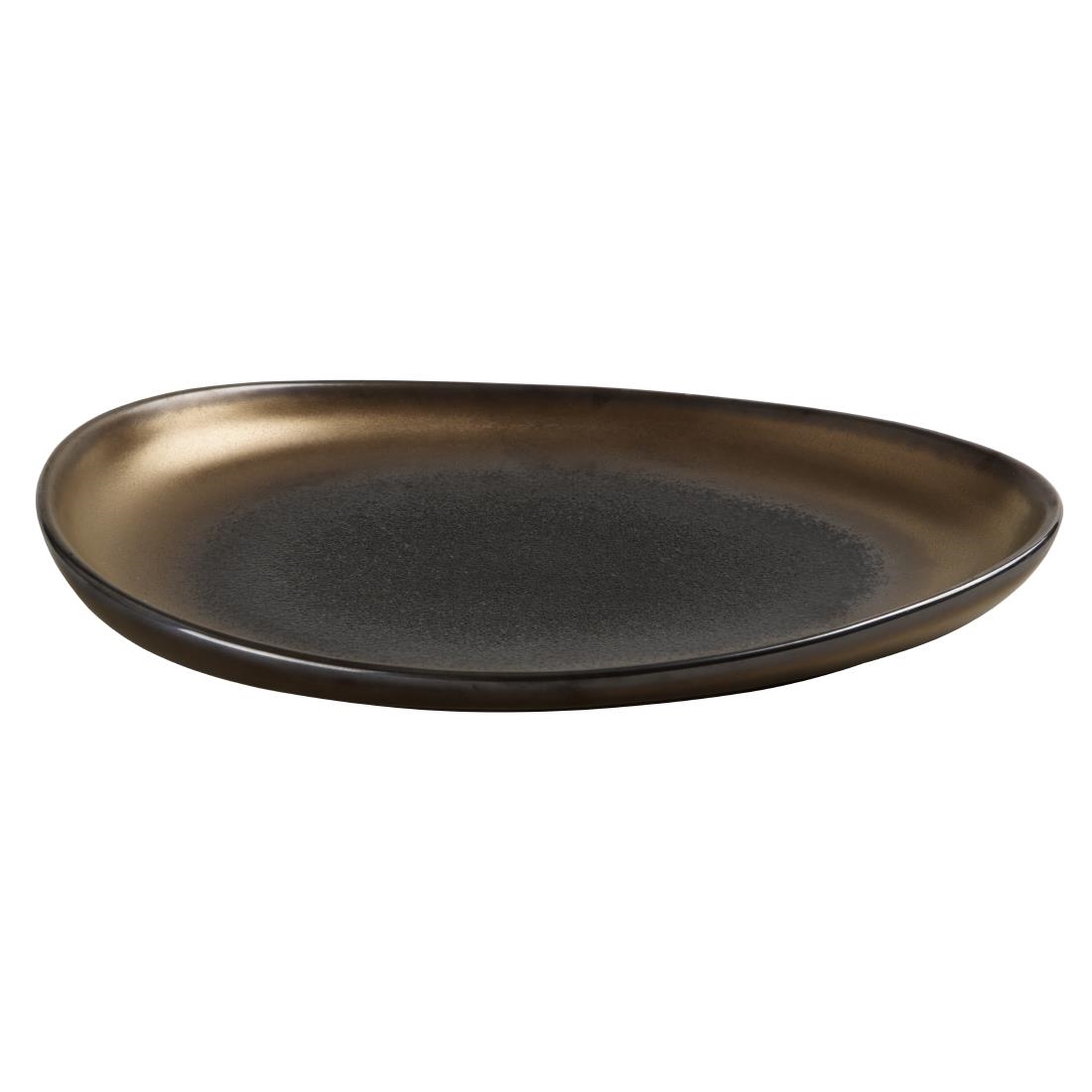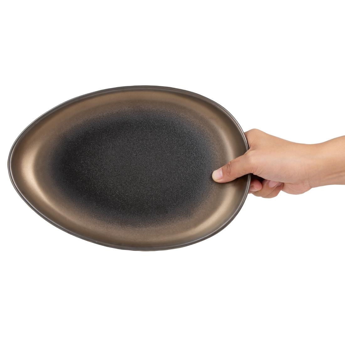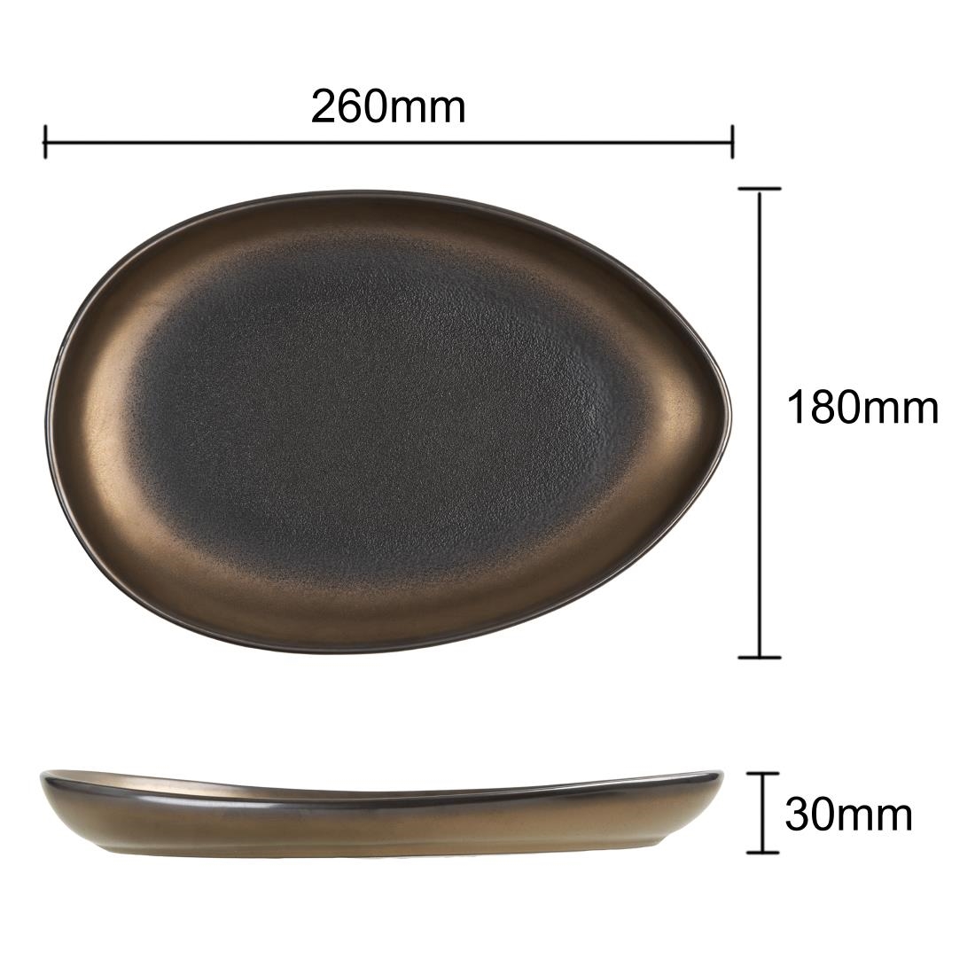 Inspired by the opulent feel of classical pottery with a contemporary twist, the Ochre collection brings an earthy yet luxurious aesthetic to any table. The Olympia Ochre teardrop plate (257x180mm) features a matte black underglaze topped with a bronze finish, creating an authentic, worn look that’s sophisticated without being showy. A reactive glaze on the base layer ensures each piece has a unique mottled centre, while the imperfect rim adds a raw, handcrafted feel.