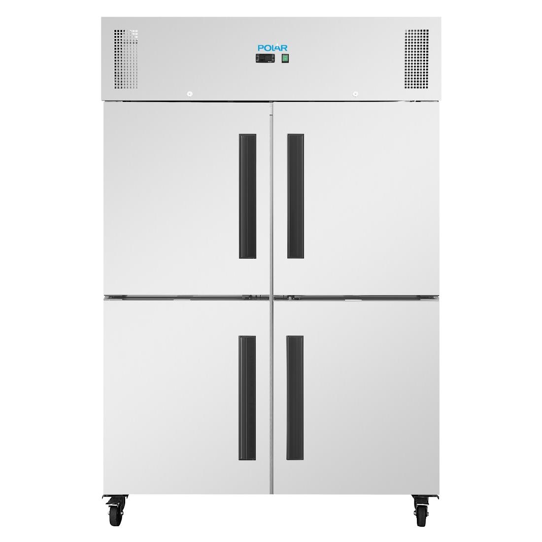 The 1200Ltr Polar G-Series upright double stable door gastro fridge delivers the capacity and reliability that modern catering operations demand. With four lockable doors, the fridge provides quick, organised storage for up to 20 double-size (2/1) GN trays, allowing seamless movement of stock between combi ovens, cold rooms and freezers. Strong, easy-clean stainless steel construction ensures durability and hygienic maintenance in busy professional areas.