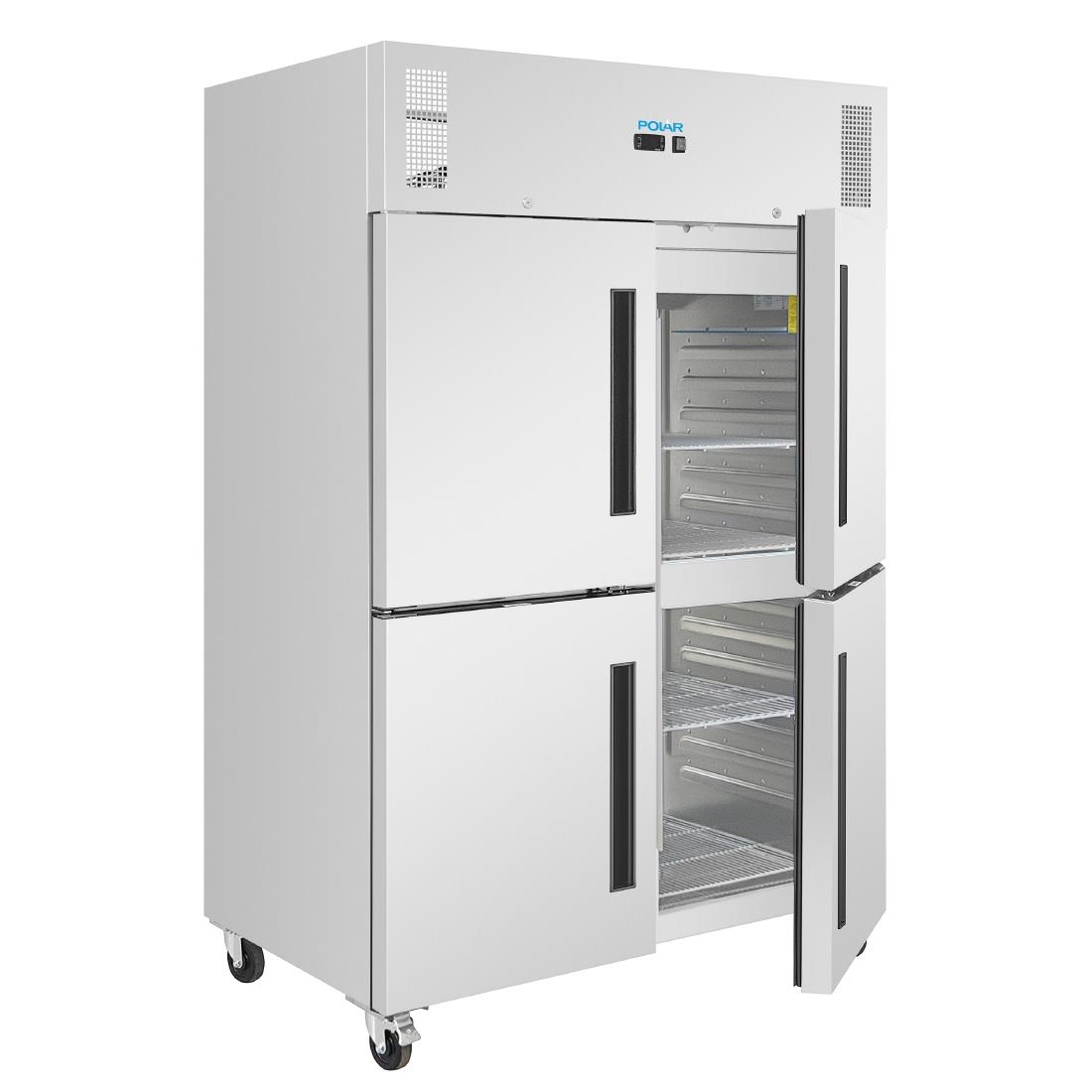 Powered by a forced-air cooling system, the Polar G-Series stable door fridge achieves rapid temperature recovery, keeping contents within set limits even during frequent door openings. Self-closing doors, a user-friendly digital controller, and automatic heated defrost all work together to reduce cut running costs and improve user convenience. Six sturdy shelves plus two floor protector shelves give flexible organisation, whilst heavy-duty castors make repositioning for cleaning or installation effortless.