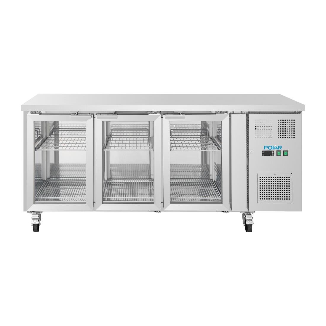 The Polar U-Series 3 door counter fridge with glass doors combines high-performance chilled storage and a durable preparation surface for busy commercial kitchens, cafes and bars. With a generous 465Ltr capacity in a 1795mm-wide footprint, the counter keeps ingredients and drinks at optimal serving temperature whilst the stainless steel top maximises prep space. Forced air cooling and a B energy rating help maintain consistent temperatures with rapid recovery after frequent openings, supporting reliable, efficient service all day.