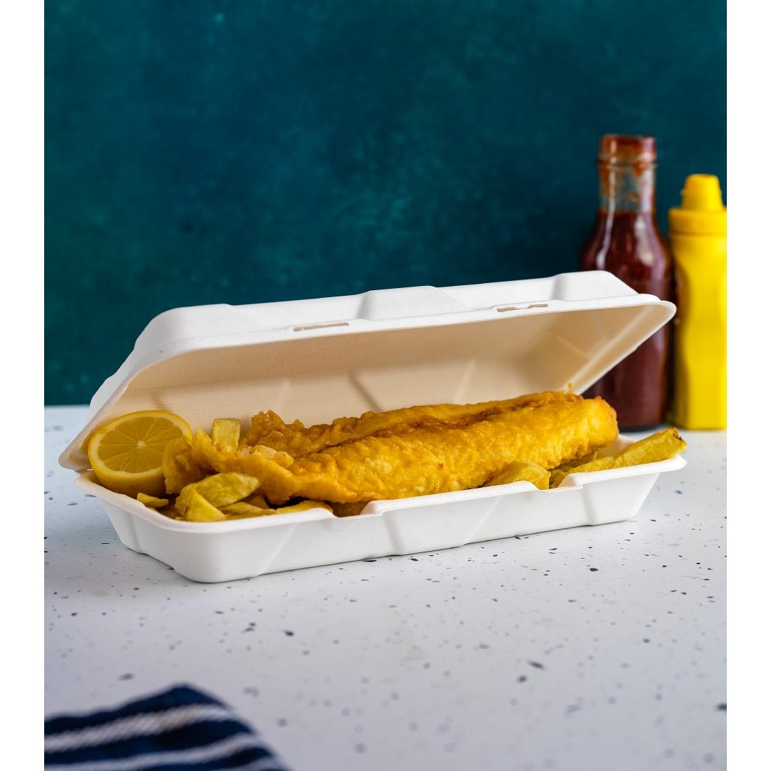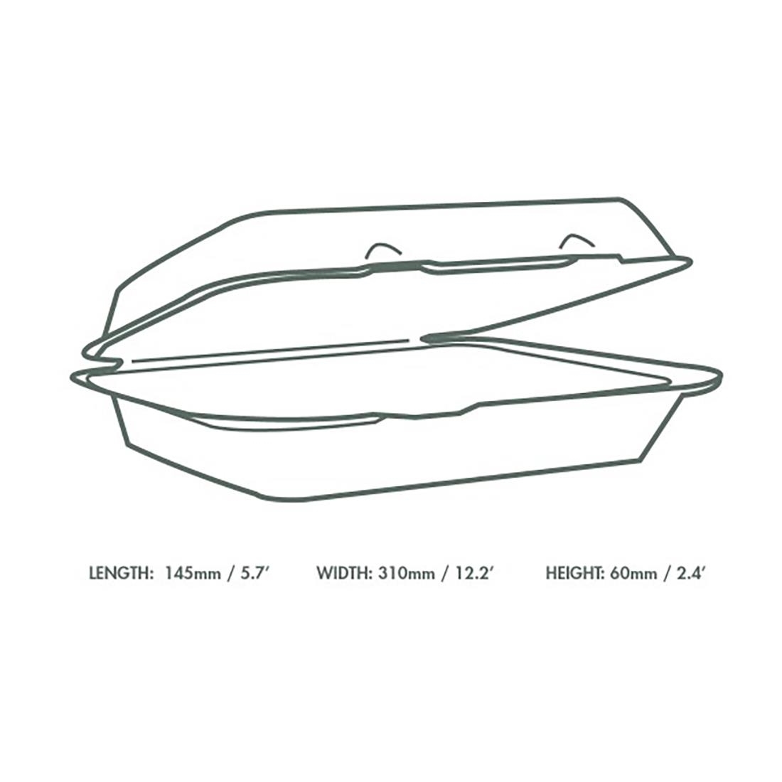 Designed for both home and industrial composting, Vegware Nourish 12×6″ moulded fibre clamshell boxes are supplied in a pack of 250.