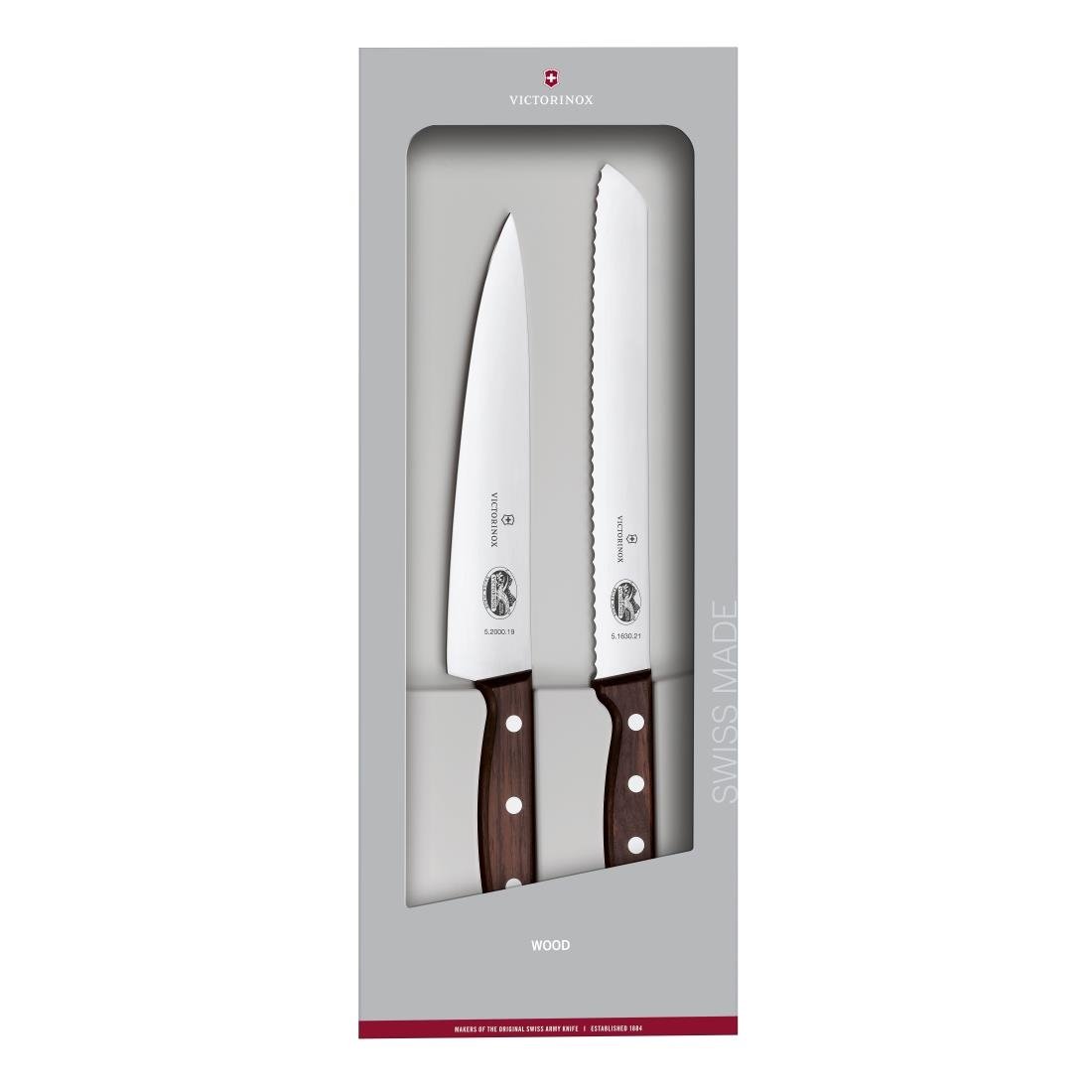 Whether you’re preparing meat, vegetables or baked goods, Victorinox’s two-piece wood kitchen set meets your cutting needs. Bringing together quality and versatility, the set consists of a 21cm bread knife and a 19cm carving knife. The bread knife’s long, serrated blade enables it to slice through bread and pastry with ease, while the carving knife’s flat blade and sharp point cut through cooked and grilled meat without affecting its natural fibres.